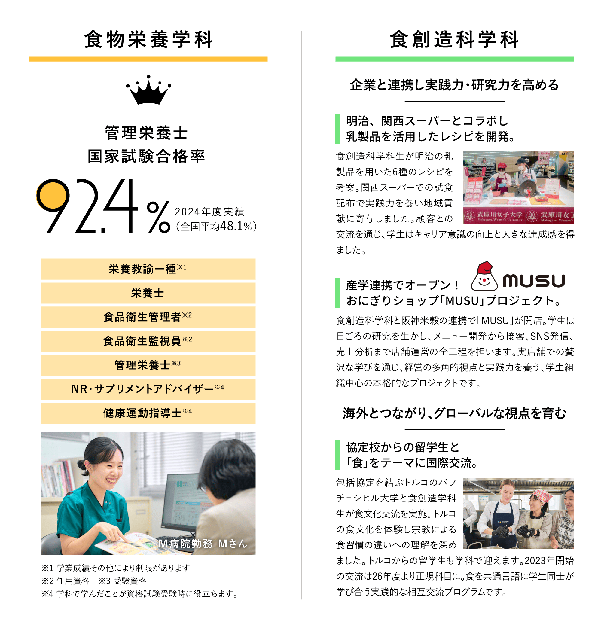 3年次から病院、保健所等の現場での実習を通して、管理栄養士に求められる知識・技能を修得します。患者さん・利用者・地域住民とのコミュニケーションのほか、医師や看護師などの他職種との連携活動から、臨床で求められる知識・技能を統合的に学習し、現場力を高めます。